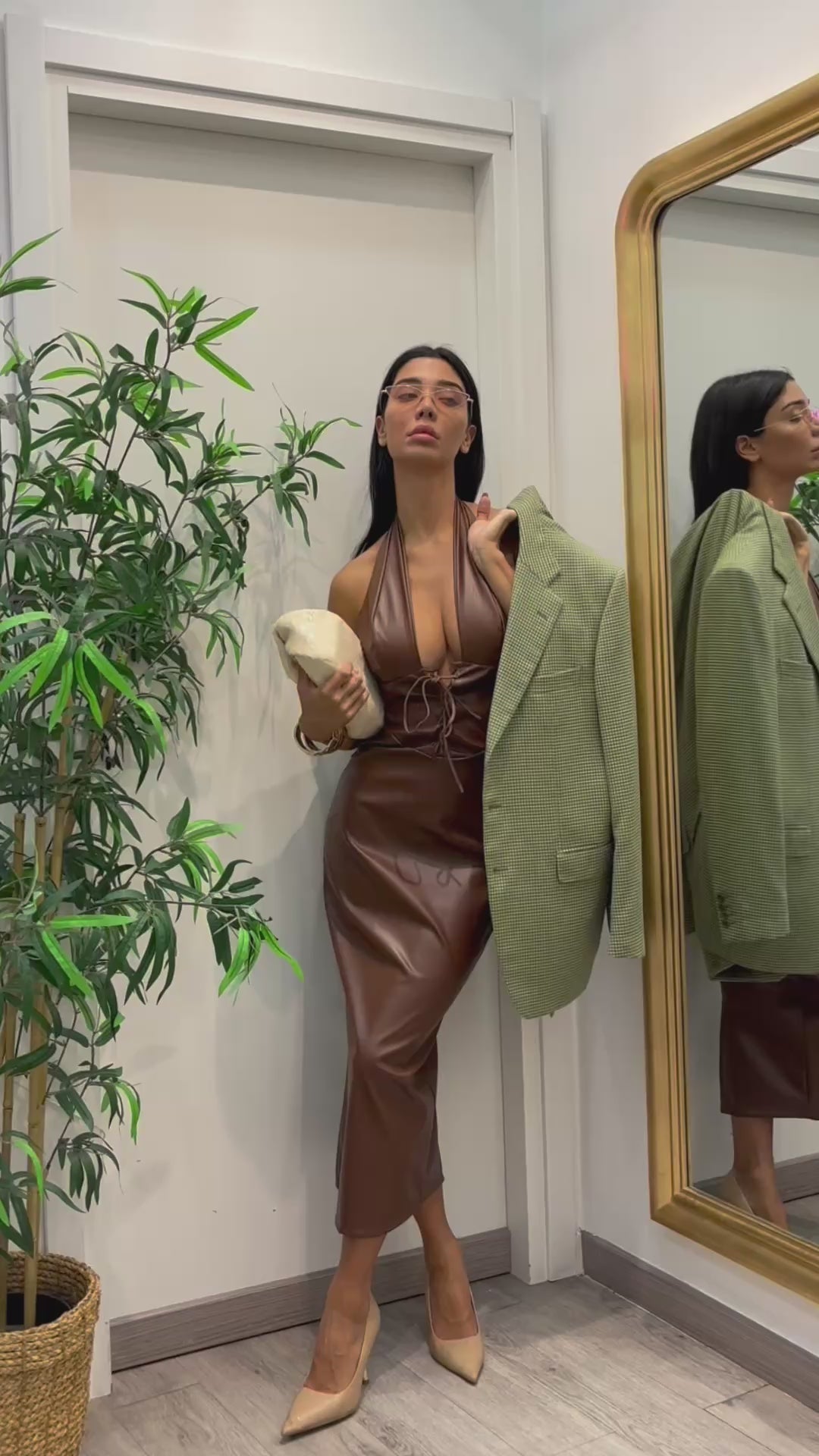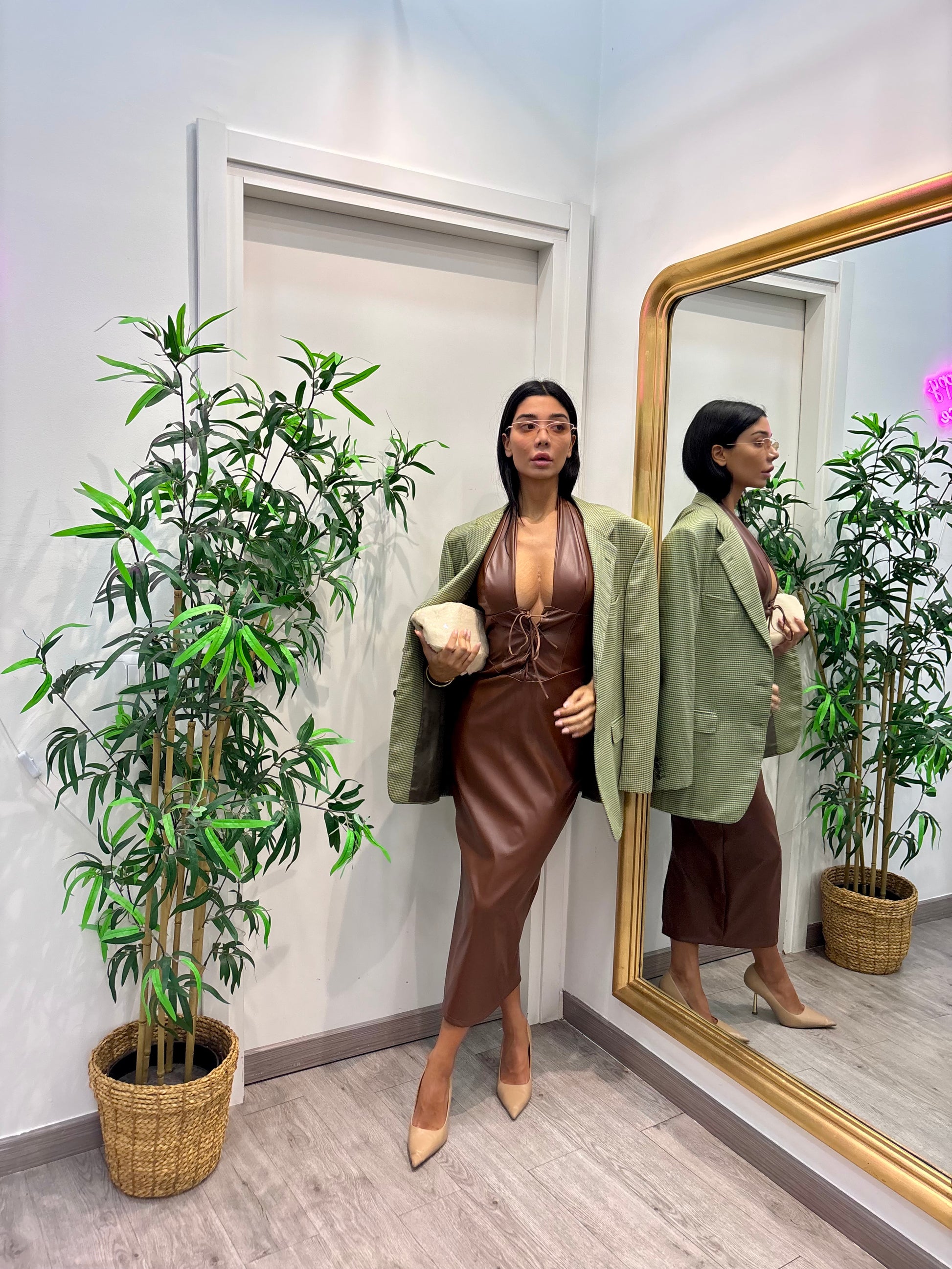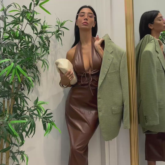 Abito midi scollo halter in ecopelle con stringhe in avanti