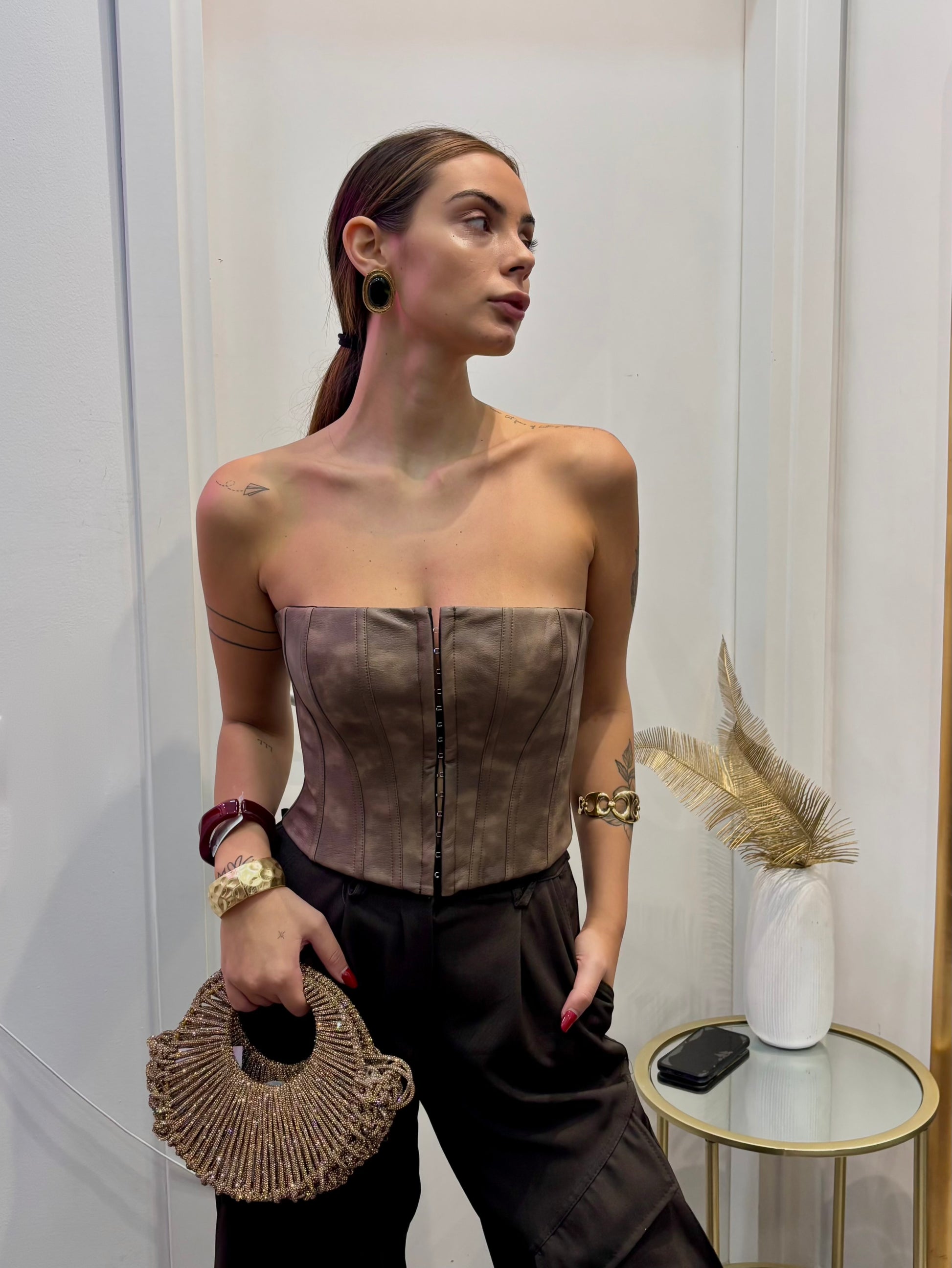 il top ha una struttura sagomata con cuciture verticali che risalta il punto vita