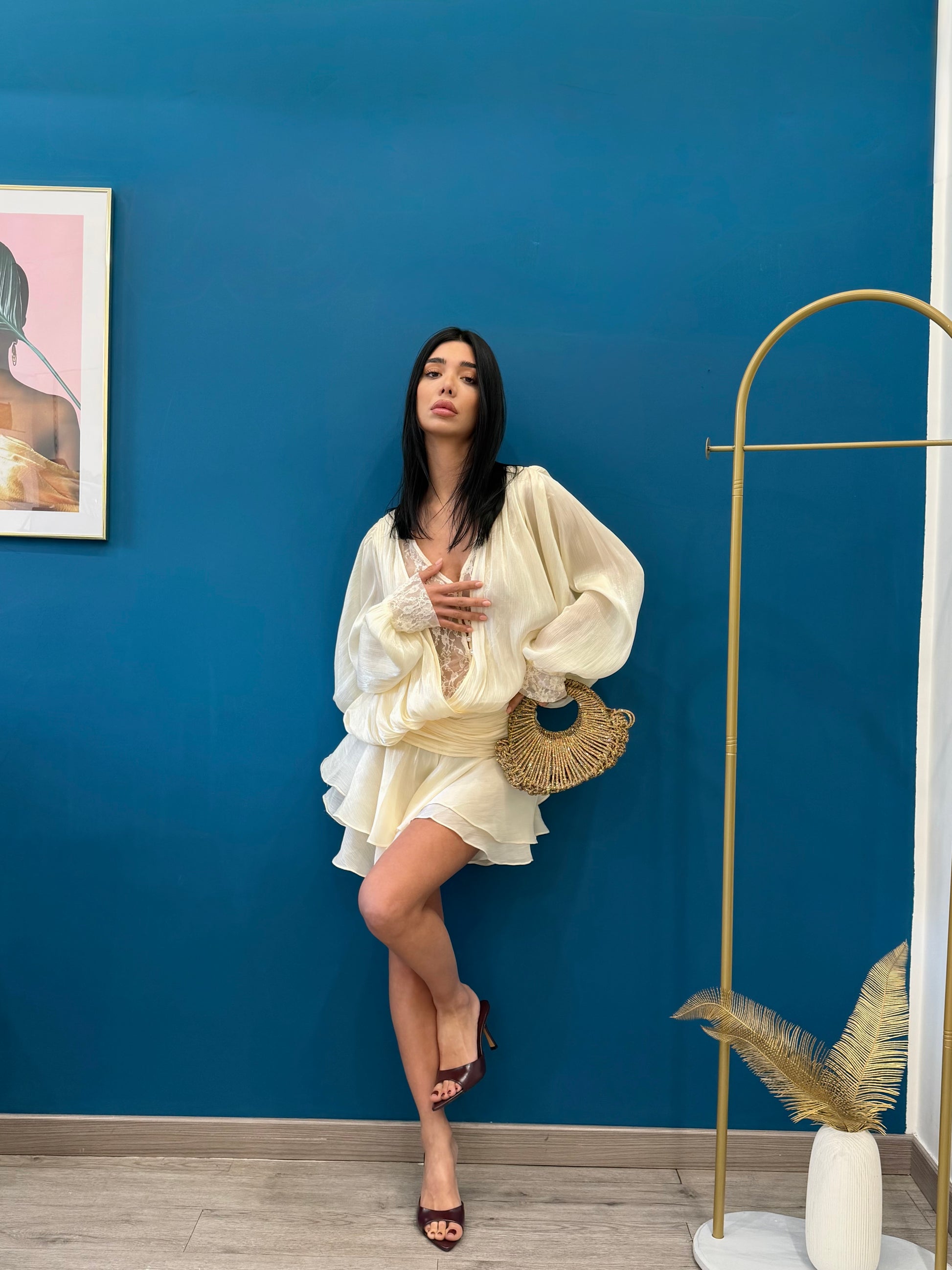 maniche ampie scollo a v con trasparenza sul seno e dietro la schiena in pizzo