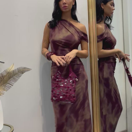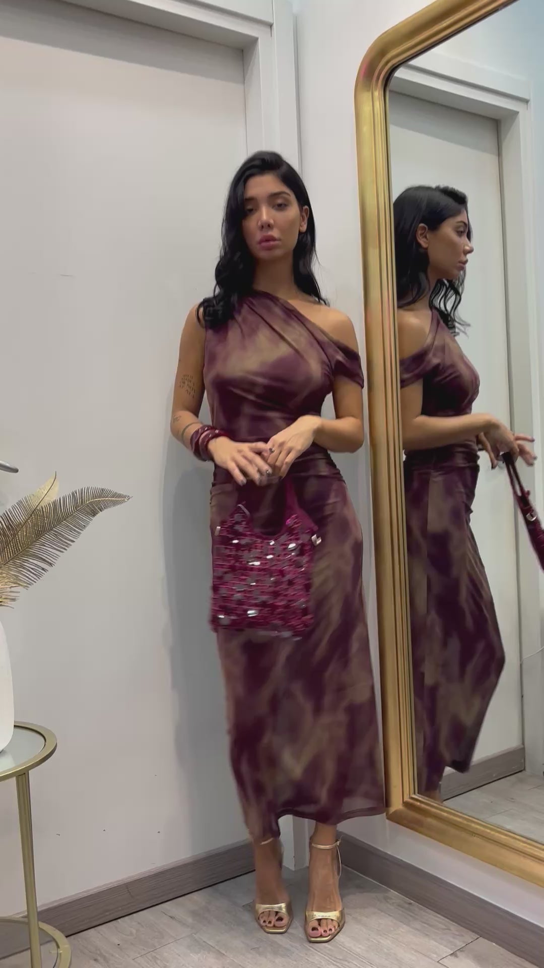 Abito midi scollo asimetrerico tessuto effetto tulle elastico stampato sottoveste incorporata in viscosa