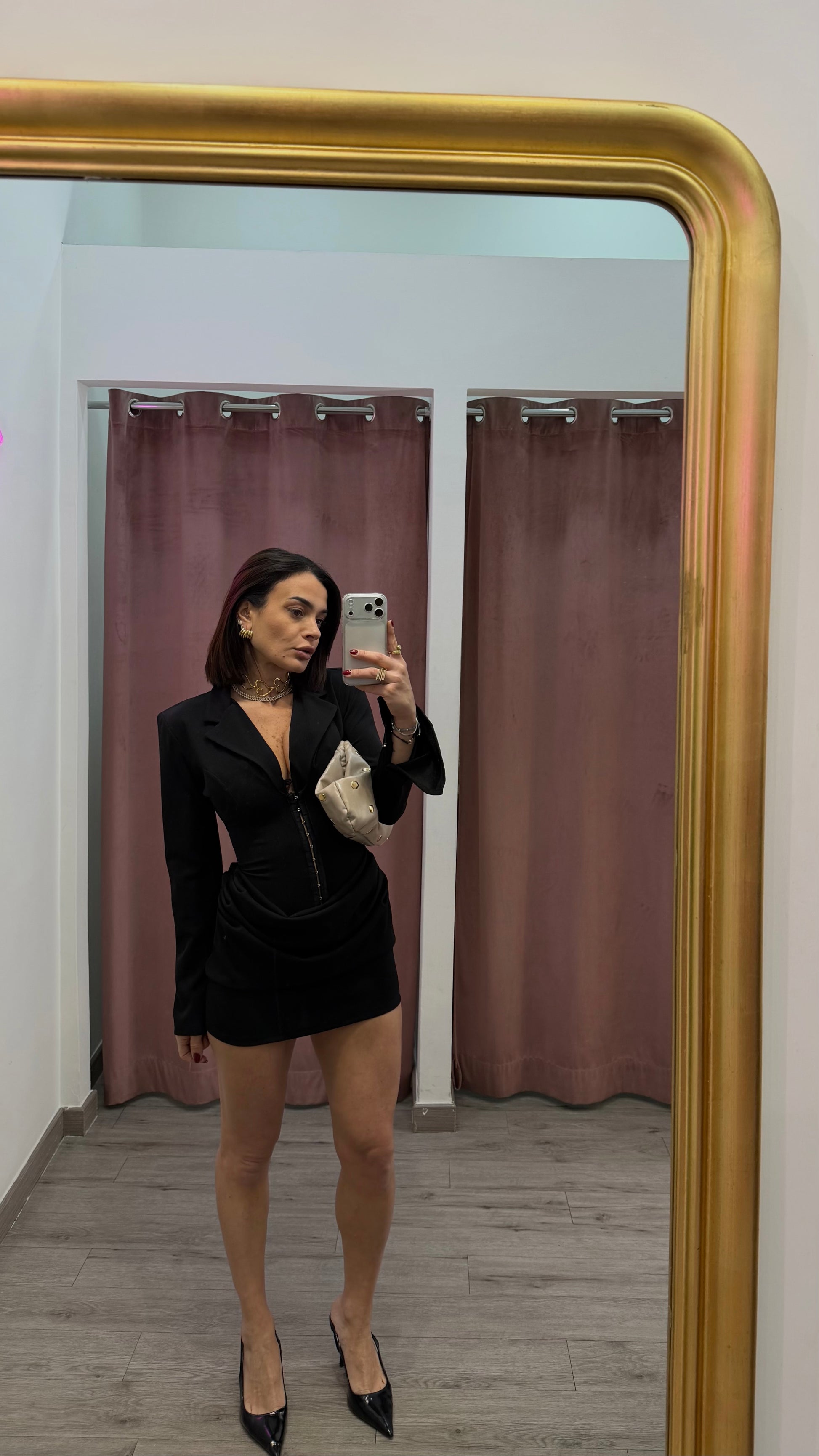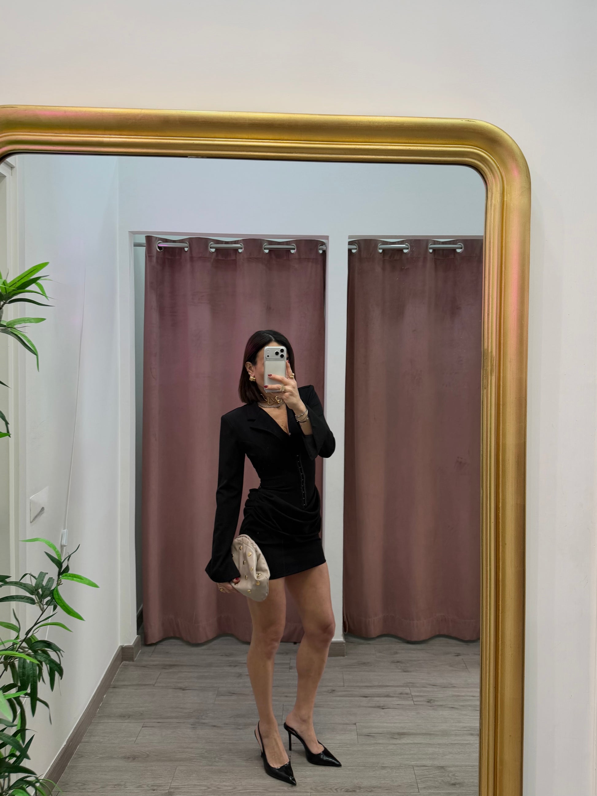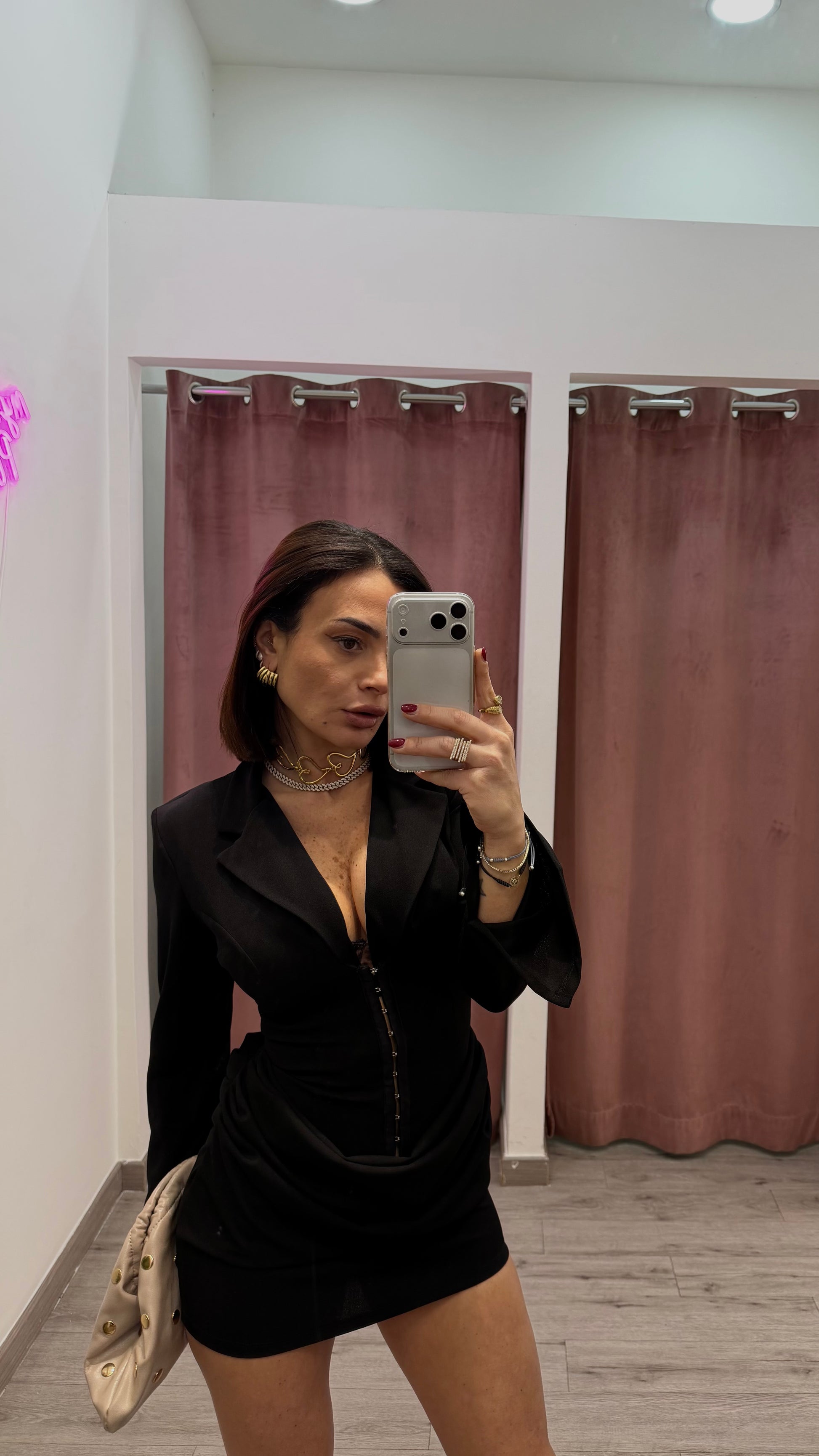 Abitino con spalle strutturate collo effetto giacca con chiusura in avanti effetto bustier