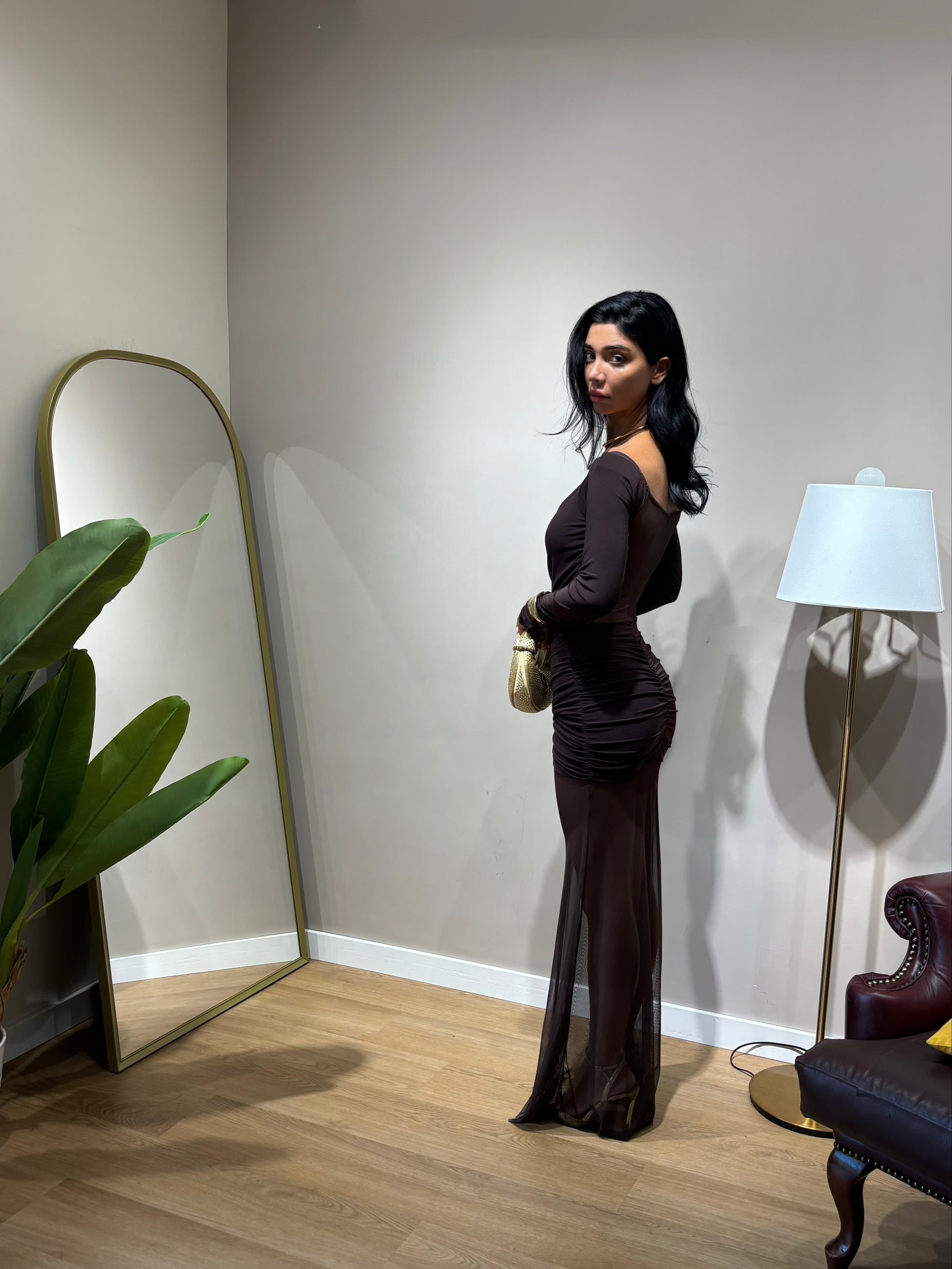 Abito marrone modello scollo bardot