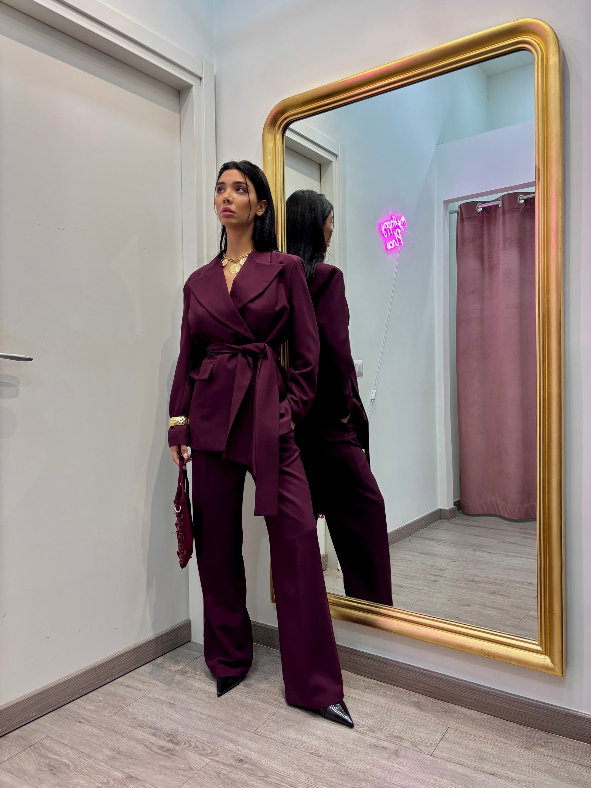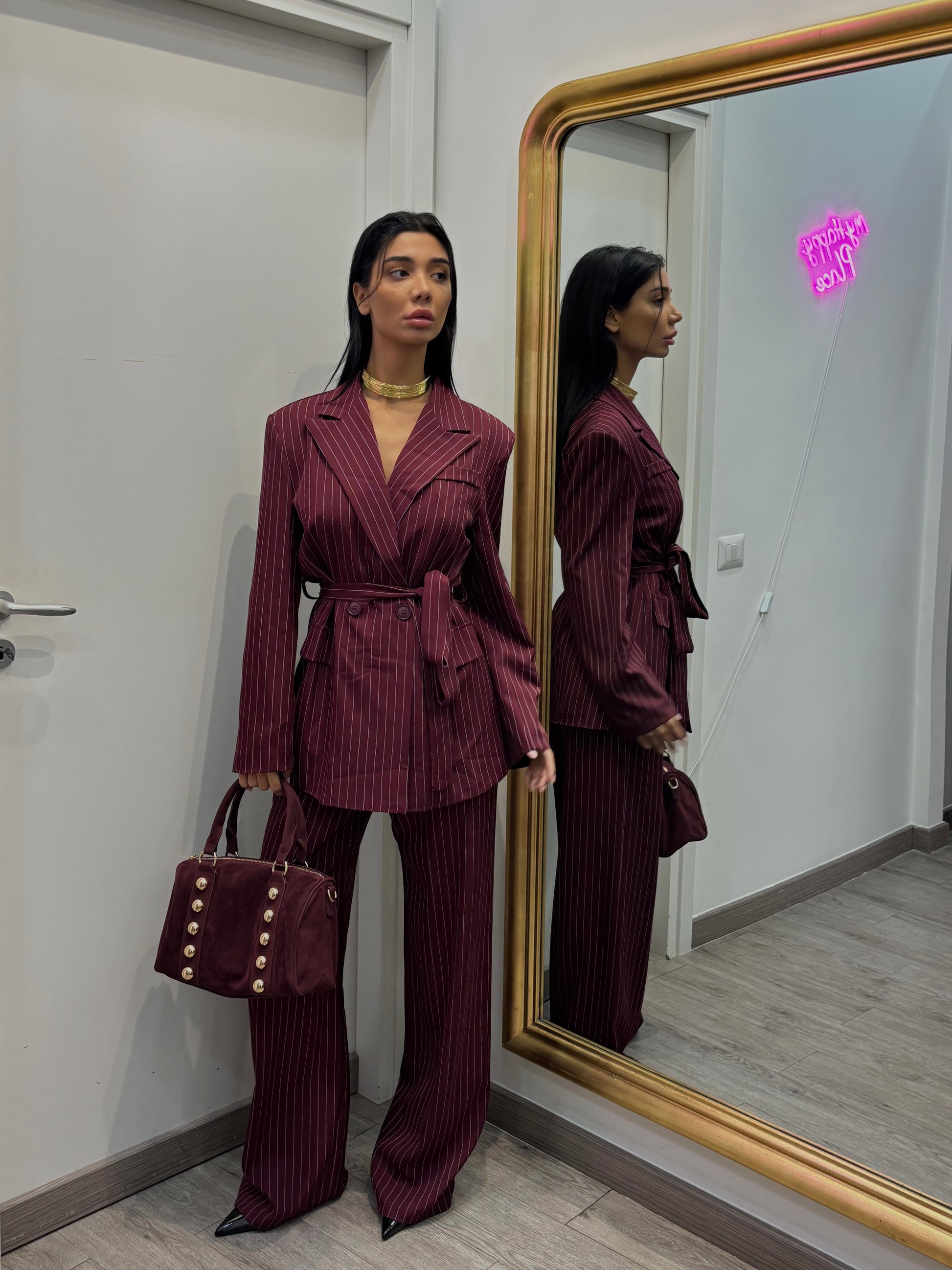 Tailleur gessato composto da blazer con con spalline